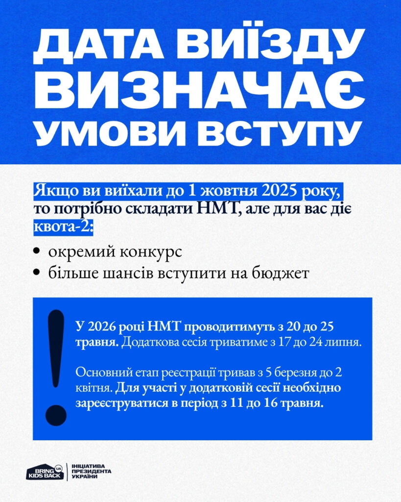 Якщо ви досі перебуваєте на ТОТ або виїхали після 1 жовтня 2025 року — вступ можливий без НМТ, через співбесіду в університеті. Якщо виїзд був раніше — потрібні результати НМТ, але діє квота-2.